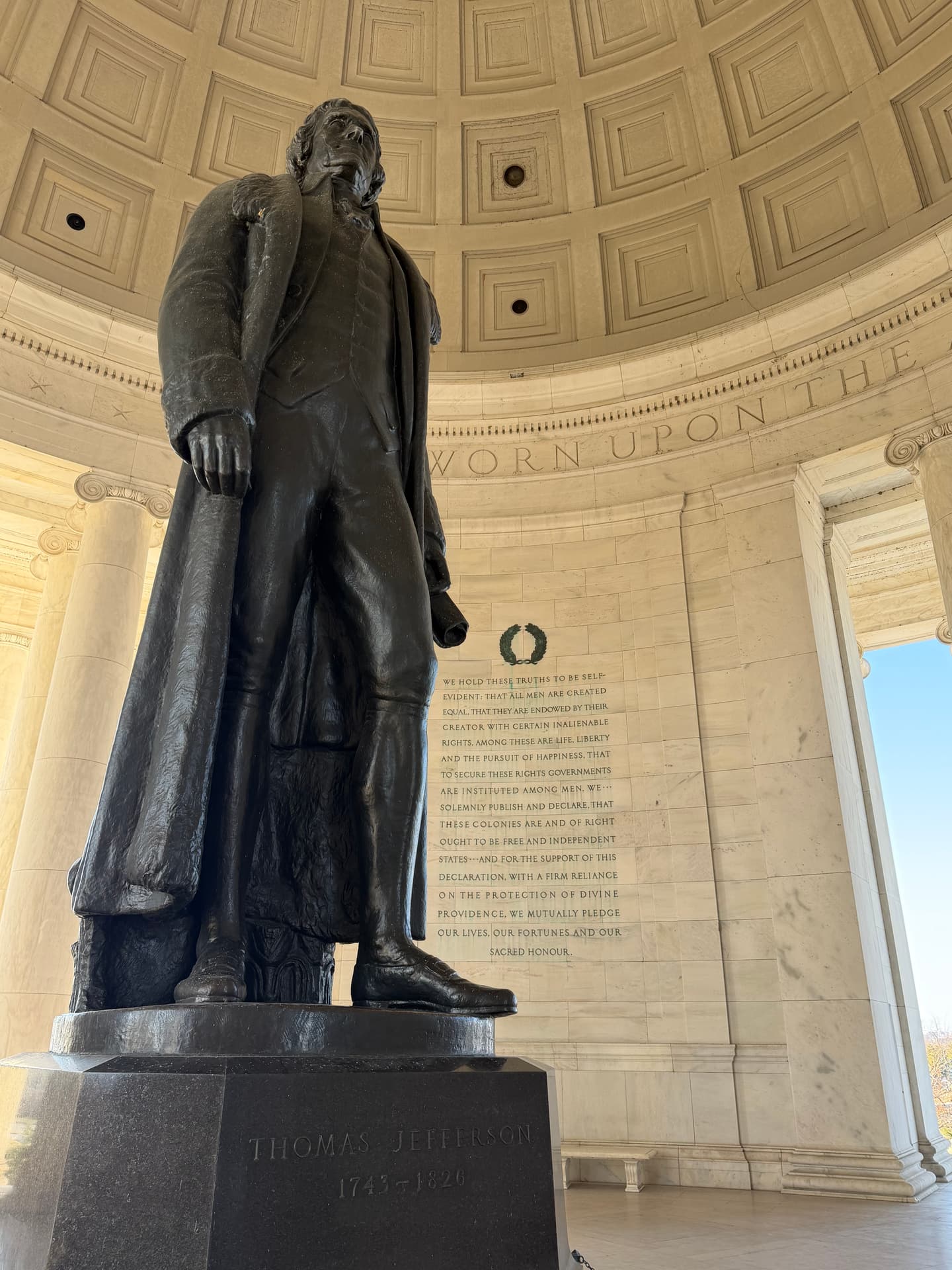 The dome itself is a hemisphere of heaven. It is symbolic cosmology. From Byzantine churches to Renaissance cathedrals, domes mark the meeting place of divine and human. To place Jefferson beneath a dome is to crown liberty with cosmology. It is to say that freedom is not rebellion — it is alignment with a higher order.
