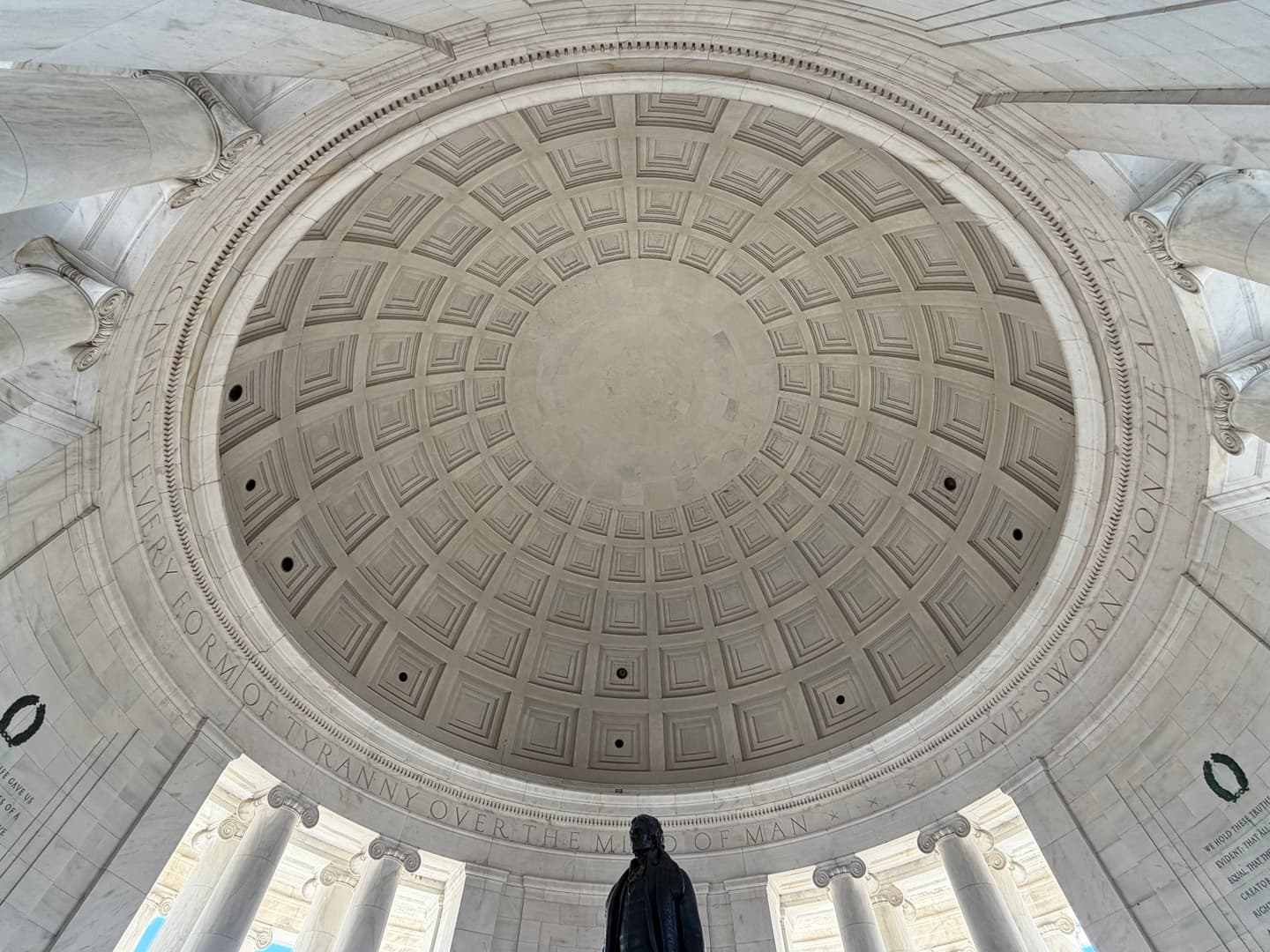 The memorial itself is no accident of design. Modeled after the Roman Pantheon, open to the sky, encircled by water, it is a temple of reason and liberty. The dome rises like a celestial vault. The Tidal Basin mirrors the heavens. Jefferson stands at the center—book in hand—as if transmitting a code. When you stand inside the Jefferson Memorial, you feel it immediately.